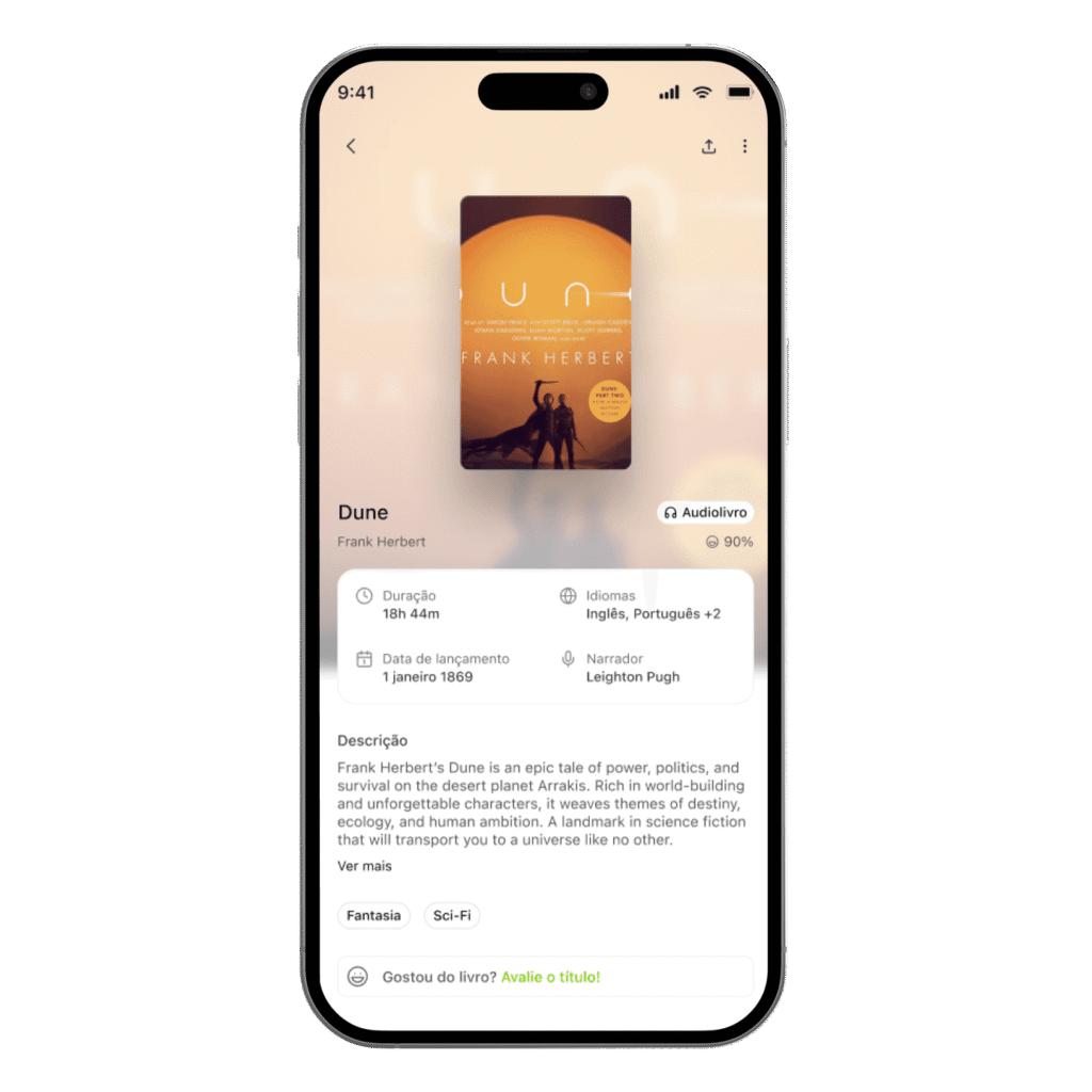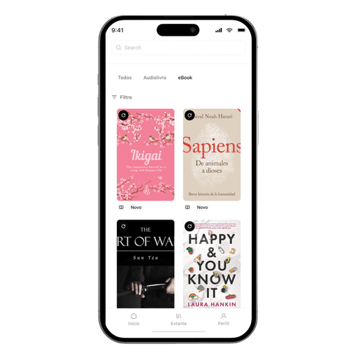 De best-sellers a livros técnicos e didáticos. Ofereça um acervo atualizado de e-books e audiolivros com uma experiência de leitura fluida, marca-páginas inteligente, smart player, e-reader customizável e modo offline para qualquer momento. App disponível em light e dark mode, para seu cliente escolher o que prefere e poder ler e ouvir quando e onde quiser.